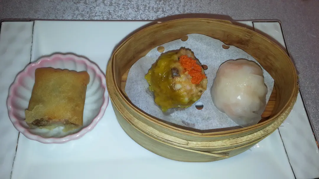 點心拼盤有蝦餃、麻辣燒賣和炸春卷各一件