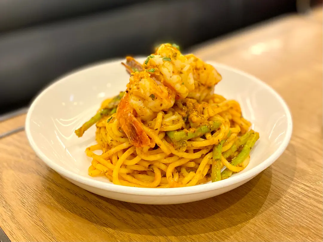 Spaghetti W/ Tiger Prawns & Asparagus in Spicy Tomato Sauce