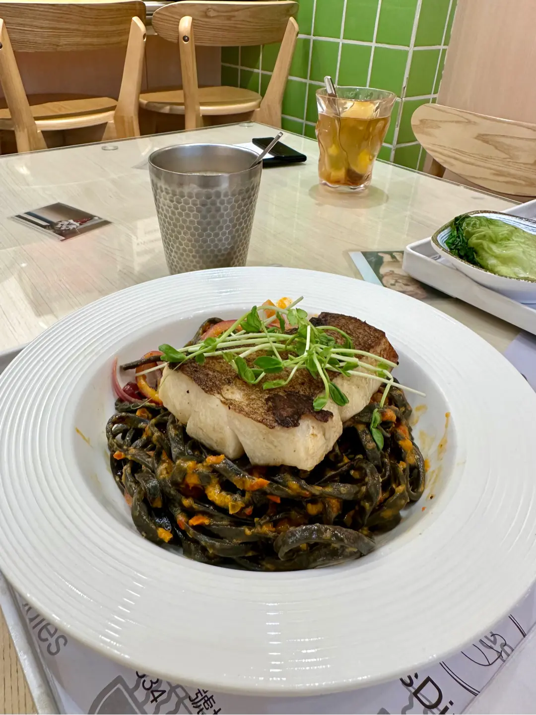香煎比目魚配檸檬辣汁手工墨魚麵