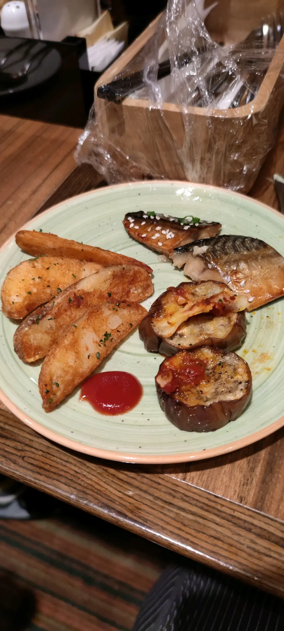 炸薯角、焗茄子、燒青魚