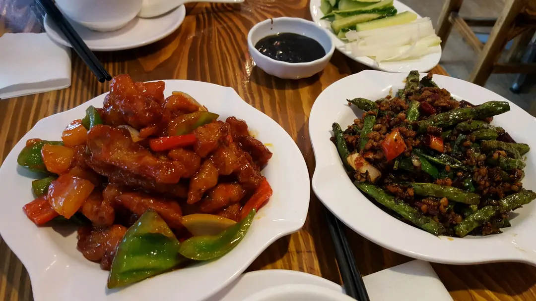sweet and sour pork; green beans