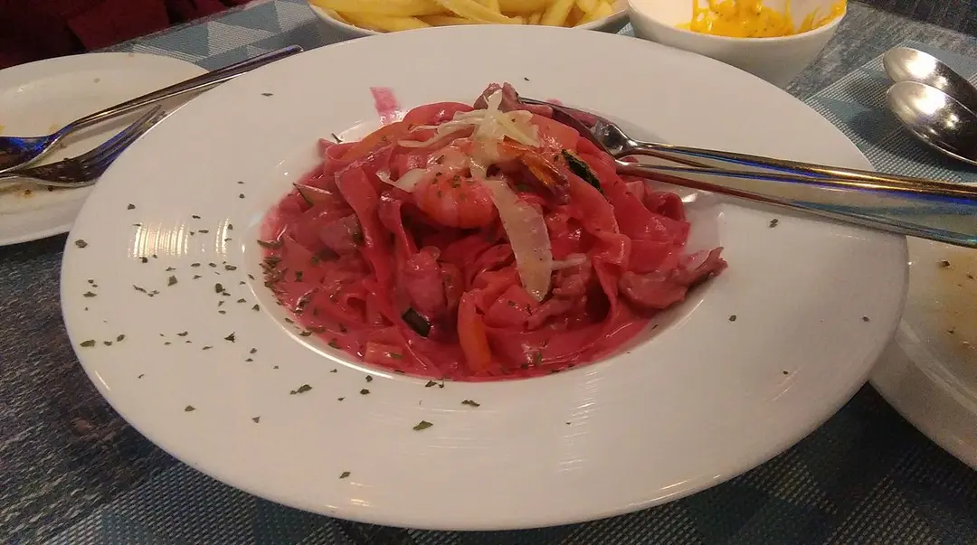 紅菜頭忌廉汁雞肉鮮蝦闊蛋麵