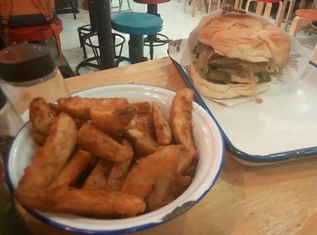 classic beef burger, potato wedges