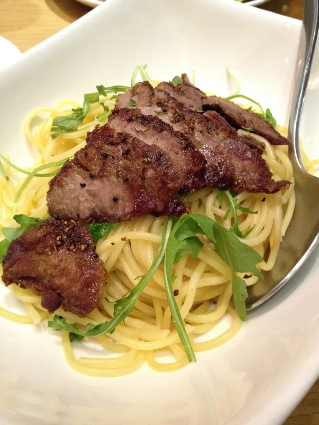 Grilled iberico pork spaghetti with garlic and rocket leaves