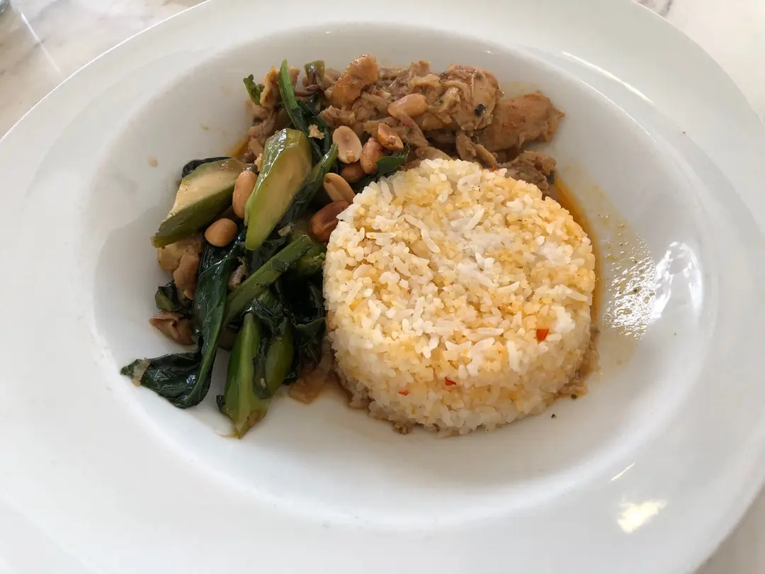 Stir Fried Lemongrass Chicken with Asian Style Vegetables, Crispy Peanut and Coconut Rice
