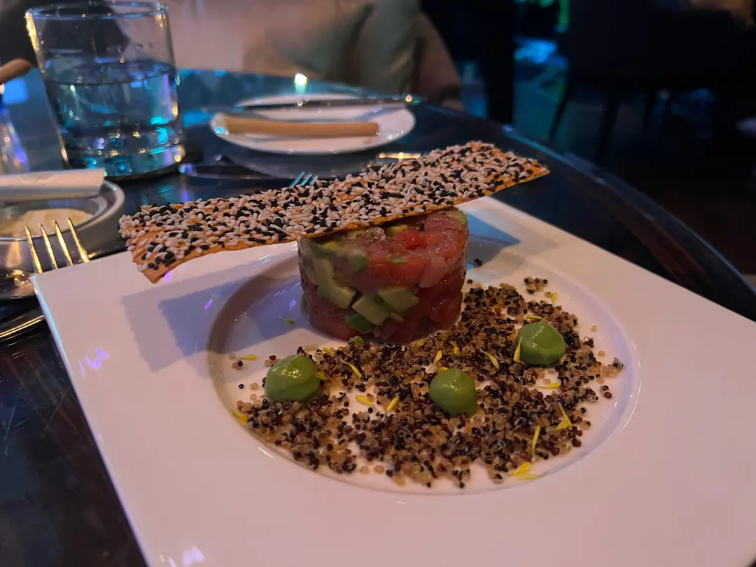 金槍魚他他,西瓜,炒藜麥,芝麻脆片
