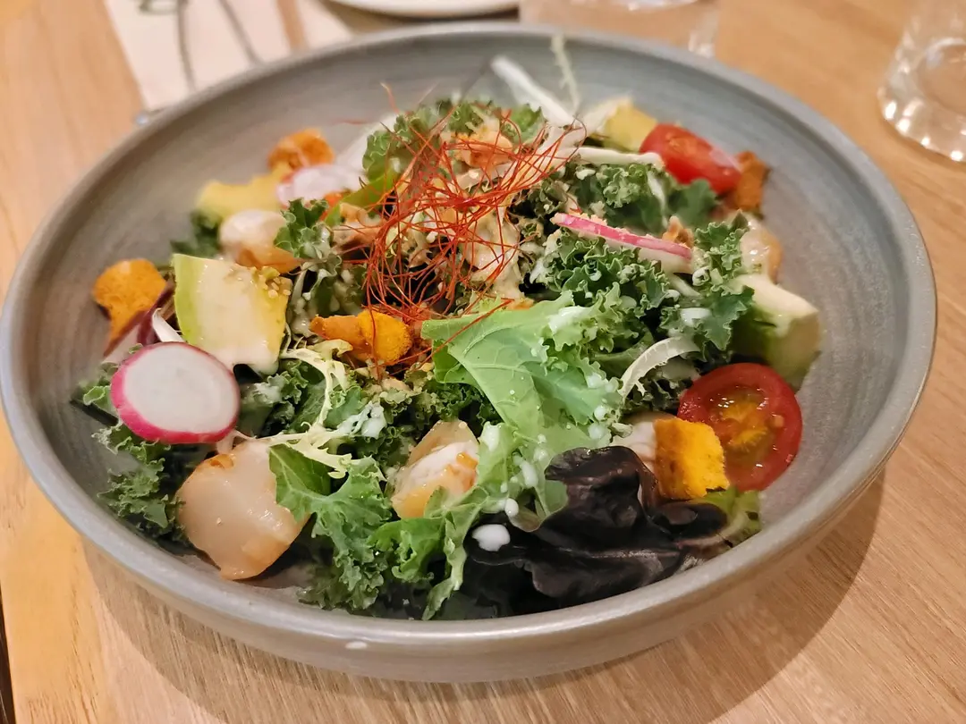 北海道帆立貝羽衣金蘭沙律配牛油果、蕃茄、合桃、中東米及乳酪柚子汁