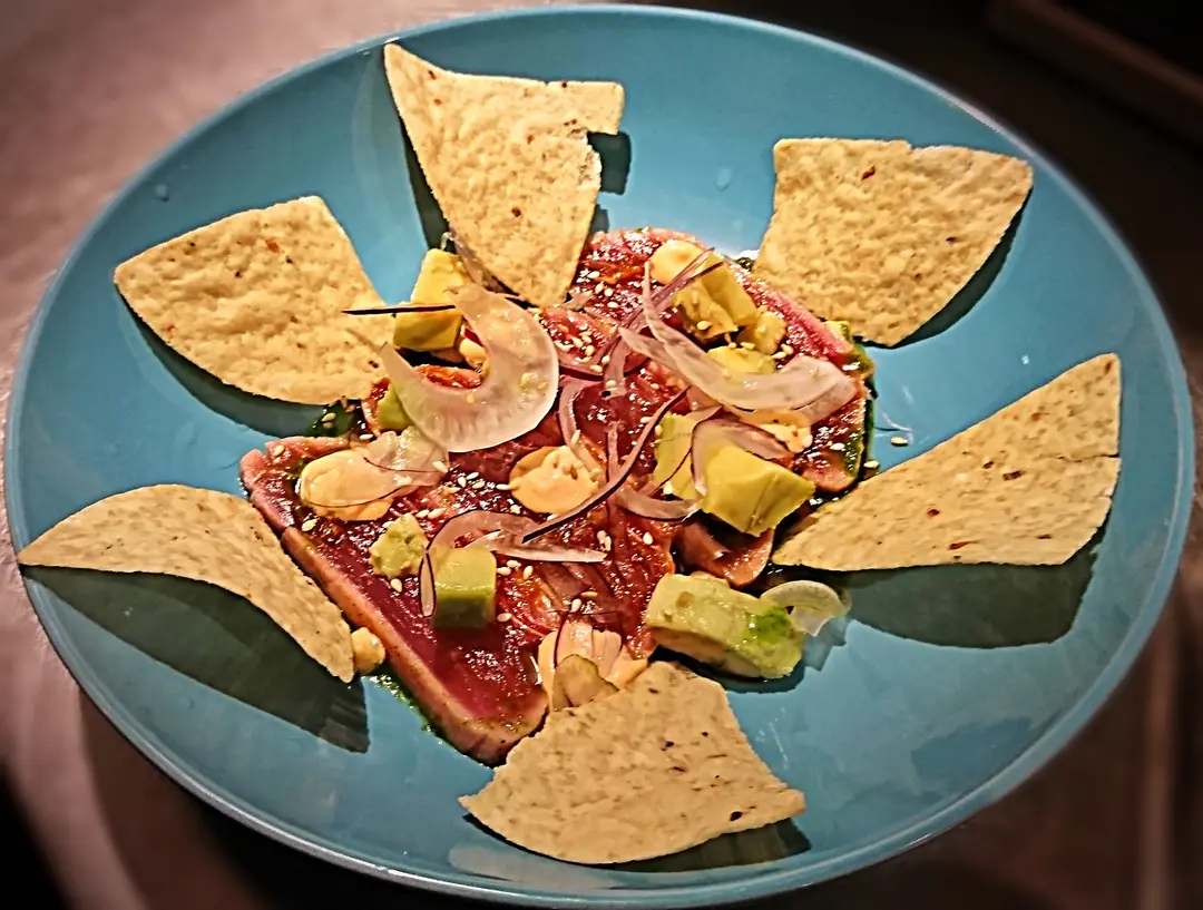 Seared tuna, citrus soy, red onion, avocado, sesame seeds, sriracha aioli, plantain chips