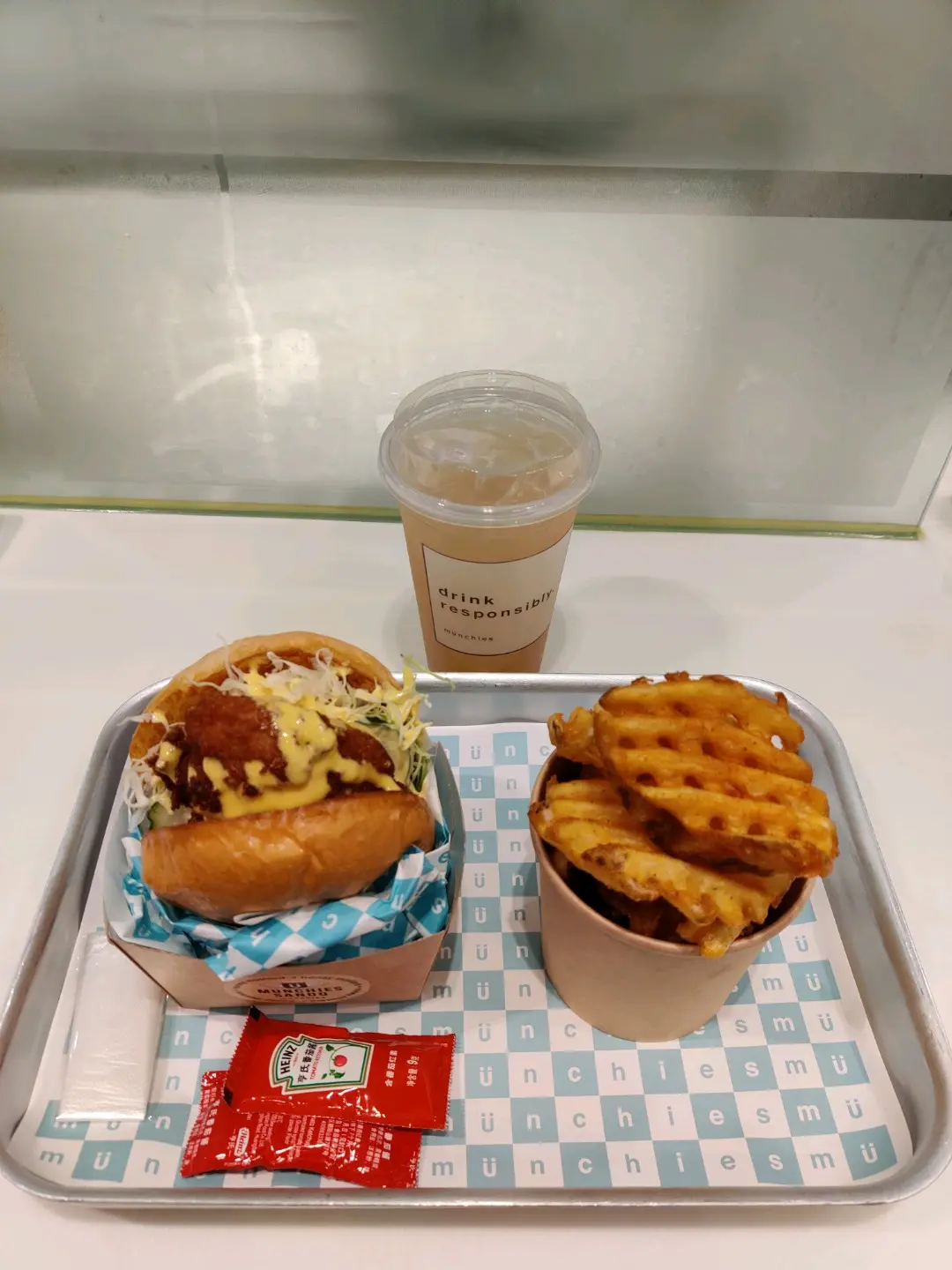 honey mustard chicken with waffle fries and seasonal lychee drink