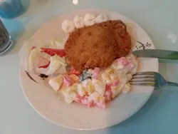 我食果碗【豉油汁豬扒飯】,豬扒好鬆軟但冇厘味道,我覺得好似冇落鹽或豉油醃過咁,炸到好油膩上枱時仲好多油鋪面,豉油汁又係淡而無味,唔鹹又唔甜唔知想點?! 杯凍奶茶都還可以,但都係非常一般。