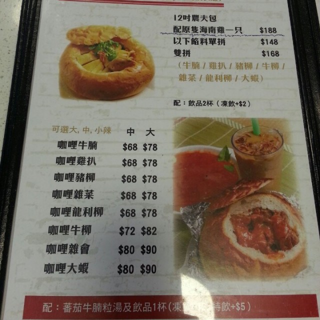 經過太子區,原來除左旺角街市上面有農夫包,太子都有分店坐低叫左個中SIZE 既農夫包,大家要留意,大食人仕先可以叫中既農夫包, 普通人食小就OK, 若果大SIZE要超大食或兩人先好叫農夫包係一個好大圓型既包焗至出面脆身,上面切開一塊做帽而入面挖成中空,放入自己選擇既材料,配以咖哩.我選左咖哩雞扒, 上枱時農夫包既大慨6至7件切成既雞扒入面已經放滿咖哩,而側邊亦會有多一碗咖哩汁以供你點包食.包皮脆口,包入面鬆軟,雞扮煎得不錯,肉身算滑,配合微辣而香濃既咖哩,正.!食到中段可以將包整爛再點側邊既咖哩汁!值得一試Read More