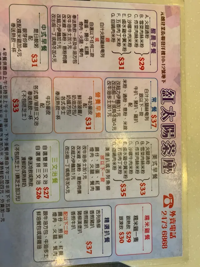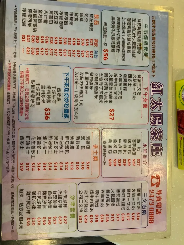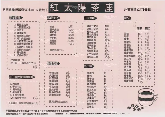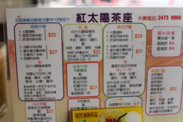 紅太陽茶座 (Yuen Long) URL: https://s.openrice.com/QrKS01sa000 Add.: 香港元朗建業街聯發洋樓地下 Tel.: +852 24736868