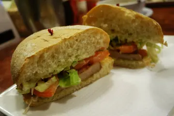 到處的食肆都因新年帶旺人流,有營業的餐廳門外大多都大排長龍,當天去到茶記竟然不乏食客等位,幸好我們倆剛好有位呢!:)我點了豬扒包配雜果沙律($30)。豬扒包賣相不俗,裡面夾有薄切豬扒、蕃茄、生菜及沙律醬。麵包皮看似脆軟,可惜咬感略韌且不夠熱,豬扒煎得不過不失,整體正常水準。原以為雜果沙律是平時吃到那種,但這裡用上火龍果粒及蜜瓜粒,配酸酸甜甜的沙律醬,造型有點詭異,份量偏少,味道麻麻。baka點了黑椒牛扒腸仔配白飯($48)。飯量正常,跟餐還配有是日蕃茄薯仔湯。飲品方面是凍奶茶,少冰少甜,但凍奶茶還是偏稀,有點像奶茶水,不合格。:(淺嚐baka的沒有走甜凍奶茶,對比下他的猶如糖水。