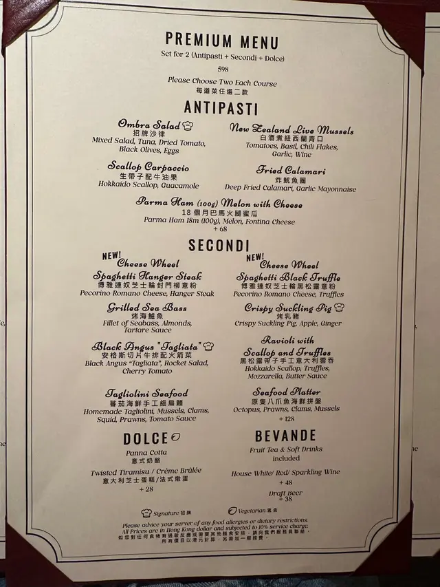 在黃竹坑喧囂中,Ombra 如同一處被陽光親吻的角落,靜靜地散發著意式小餐館的溫馨氣息。甫一踏入,便被那手繪的西西里海岸風情壁畫所吸引,彷彿瞬間置身於地中海的懷抱。這裡,不僅僅是用餐的地方,更是一場視覺與味蕾的雙重旅行。  Ombra 的用餐體驗,總是在意想不到的地方給你驚喜。幾乎每一桌的顧客都會點上一份 Cheese Wheel Spaghetti Black Truffle (博雅連奴芝士輪黑松露意粉)。這道菜的高潮,不僅僅在於黑松露的香氣,更在於意粉與芝士融合前的火焰瞬間!店員推著巨大的芝士輪,在桌邊點燃火焰,看著火焰在芝士上舞動,融化出濃郁的芝士精華。隨後,熱氣騰騰的意粉被倒入其中,充分裹上芝士,最後再灑上珍貴的黑松露。整個過程就像一場精彩的表演,讓人忍不住舉起手機記錄下這難忘的瞬間,氣氛熱烈而歡快。這次我們選擇了 Premium Menu,除了這道必點意粉,其他菜品也充滿驚喜:  Scallop Carpaccio (生帶子配牛油果):新鮮的帶子與牛油果的清新完美結合,口感嫩滑,清爽開胃。 New Zealand Live Mussels (白酒煮紐西蘭青口):青口飽滿多汁,白酒的香氣恰到好處地提升了海鮮的鮮甜。 Crispy Suckling Pig (烤乳豬):外皮酥脆,肉質鮮嫩,油脂豐腴,搭配特製醬料,滋味在舌尖蔓延,令人意猶未盡。特別適合與朋友一同分享     。  甜品方面,Panna Cotta (意式奶酪) 和 Tiramisu (提拉米蘇)都表現出色,為這頓美好的晚餐添上亮麗的一筆。餐廳提供了免費畫碟服務,用巧克力寫上了 "Congratulations!" 的字樣,為這頓美好的晚餐添上亮麗的一筆。提拉米蘇口感綿密,咖啡和可可的味道濃郁,甜而不膩,讓人意猶未盡。飲品方面,我點了 Fruit Tea (水果茶) 和 Apple & Cucumber  (蘋果青瓜),清新解膩。朋友點的 Passionfruit Yakult (百香果益力多) 據說也很不錯。  Ombra 的 vibe 真的非常適合約會或慶祝。店內還有生日畫碟服務,為特別的日子增添了一份溫馨與浪漫。如果你也想在海洋公園旁尋找一家性價比高的意式餐館,Ombra 絕對不會讓你失望。 總之,Ombra 是一家充滿誠意和溫度的意式小餐館,值得你前來一試。 …Read More