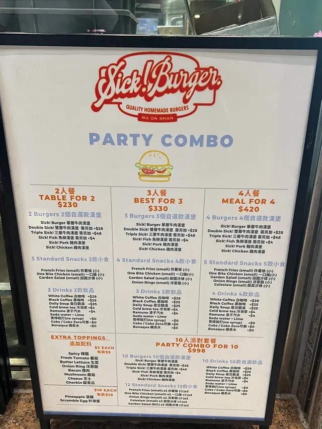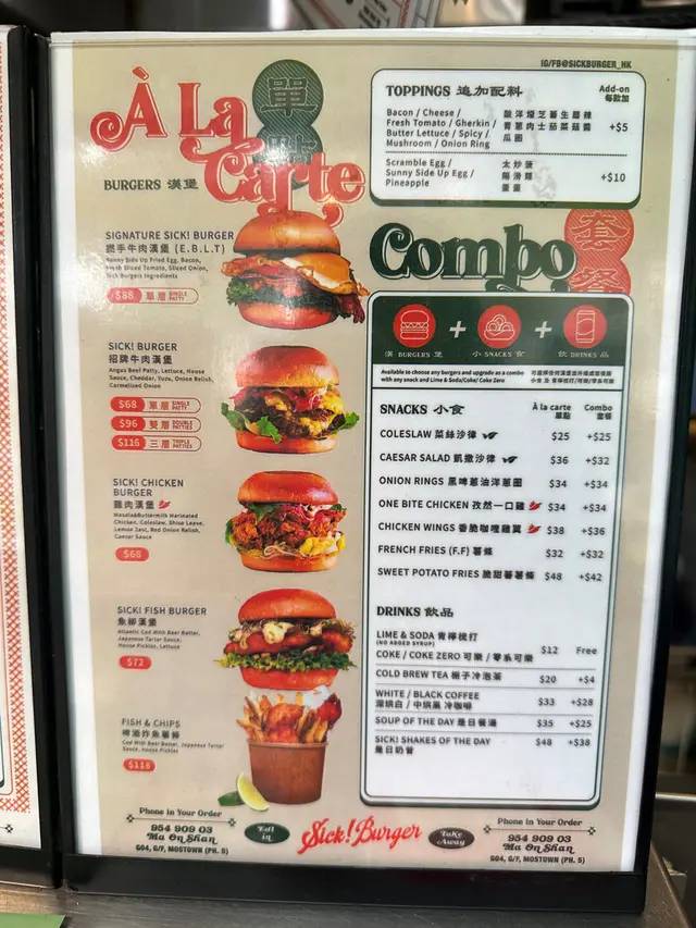 早幾日,我自己一個下晝4:30去咗Sick Burger食下午茶餐當埋晚餐,我嗌咗一個$48嘅下午茶餐,有一個經典芝牛漢堡和一罐汽水。小店只有幾張枱,想有位坐都要碰運氣。呢個經典芝士牛肉漢堡唔算太大個,但係對我嚟講都夠飽,牛肉係手打牛肉,非常美味,加埋芝士同個包,真係好好食,好味過麥當勞一百倍!跟餐附送嘢飲🧃,我新join咗會員仲送一罐,所以我有兩罐汽水。總括嚟講,呢間小店值得大家嚟馬鞍山幫襯,下午茶餐非常抵,下次有機會我都會再去食!希望大家多啲支持小店啦!…查看更多