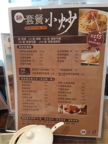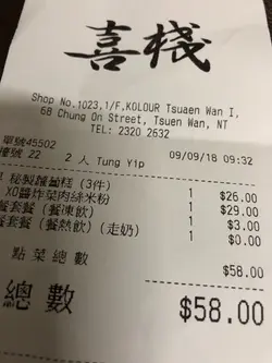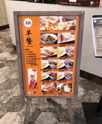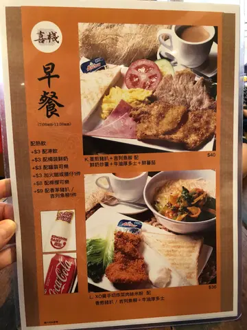星期日嘅早上,早餐唔想食得太豐富,來喜棧就是可以豐儉由人,少少哋⋯⋯食住先,轉頭又和家人飲茶嘛⋯⋯門口擺咗個巨大餐牌,看圖識字簡單地吸引客人入內:)每個早餐都可以靈活變化,加$3 火腿或腸仔、加$9 香茅豬排或炸魚枊⋯⋯轉凍飲、維記樽裝鮮奶、罐裝可樂⋯⋯通通加$3, 再想飲檸樂就加$8 ,這樣嘅簡單清楚易明嘅餐牌,值得一讚⋯⋯