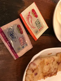 秘製蘿蔔糕,全場最平$26,包熱飲:)就是喜歡他們的甜、辣醬,獨立包裝,感覺乾淨衛生