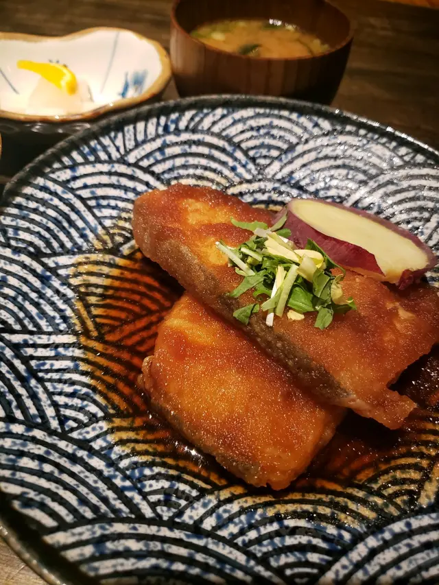 大根比目魚,日本的大根就是蘿蔔,特別鮮甜好吃,少渣又多汁,今次大根被磨成秘製的醬汁,墊高兩塊高質的比目魚,比目魚皮脆肉嫩,連平少不多吃魚的我一嚐之後,真心覺得好好味,魚肉有口感,不粉,皮有脆感,乃是煎出來的果效,拌上日本珍珠米,濃烈的QQ感逼上心頭了。我愛比目魚,比目魚出奇地不嫌棄我,不經意地已殲滅了整塊比目魚連汁,半粒飯也消逝了!