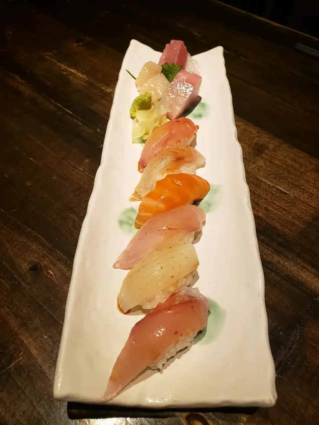 剌身三點配日式鳥冬,有吞拿魚、帶子、彿魚、鯛魚、池魚,全部也是九州直送,難怪可以奇鮮無比,刀功一流,細緻推崇,日本的壽司如處理得好,就是人間極品,令人齒縫留香,內藏魚鮮,永續難忘。