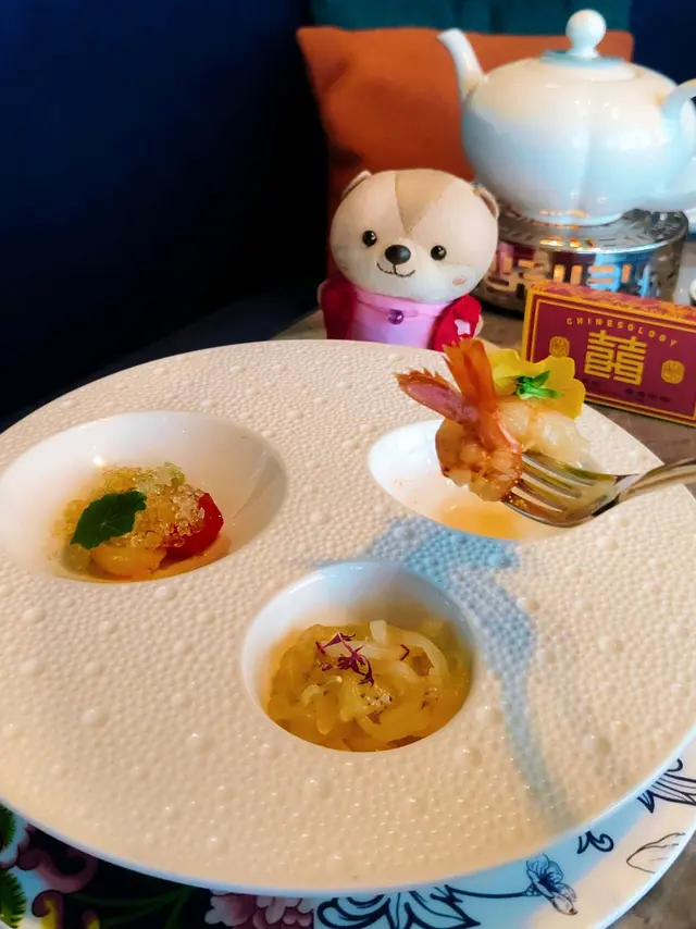 包括:百香梅茄.、三絲海蜇及20年古越龍山花雕浸鮮蝦。百香梅茄用意大利蕃茄梅子醬,梅茄酸甜多汁。海蜇口感爽脆,味道給人一種特別的感覺。鮮蝦爽口味,吃起來挺香酒味。