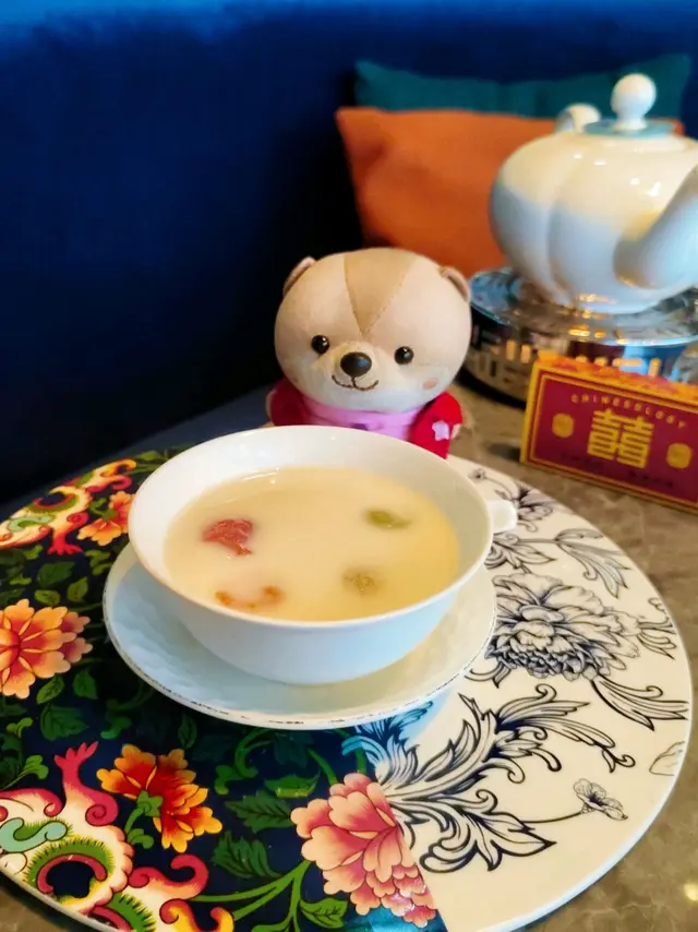 湯用的是時令四果,加入杏汁和螺頭熬製而成。雪白色的湯飲,有顏色吸引的食材,賣相會吸引點。是個養生又滋潤的湯,味道清甜味道不會太濃,整體口感較豐富。