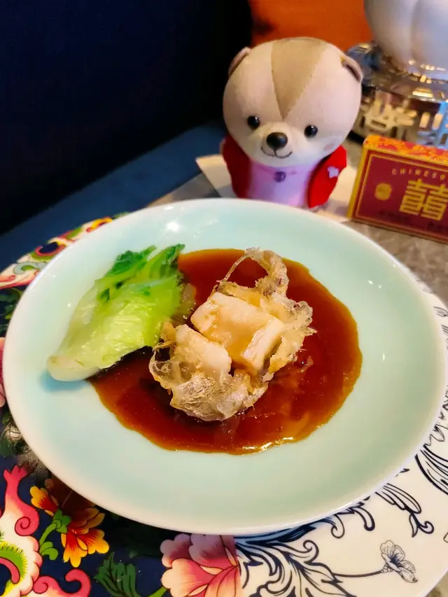 金黃色的賣相相味道挺香的,炸漿用芋頭包著帶子,吃起來口感酥脆。帶子肉質厚身,味道鮮味爽口。鮑魚汁用花膠熬製,味道香濃可以喝的。蔬菜吸收湯汁後,吃起來較吸引欵。