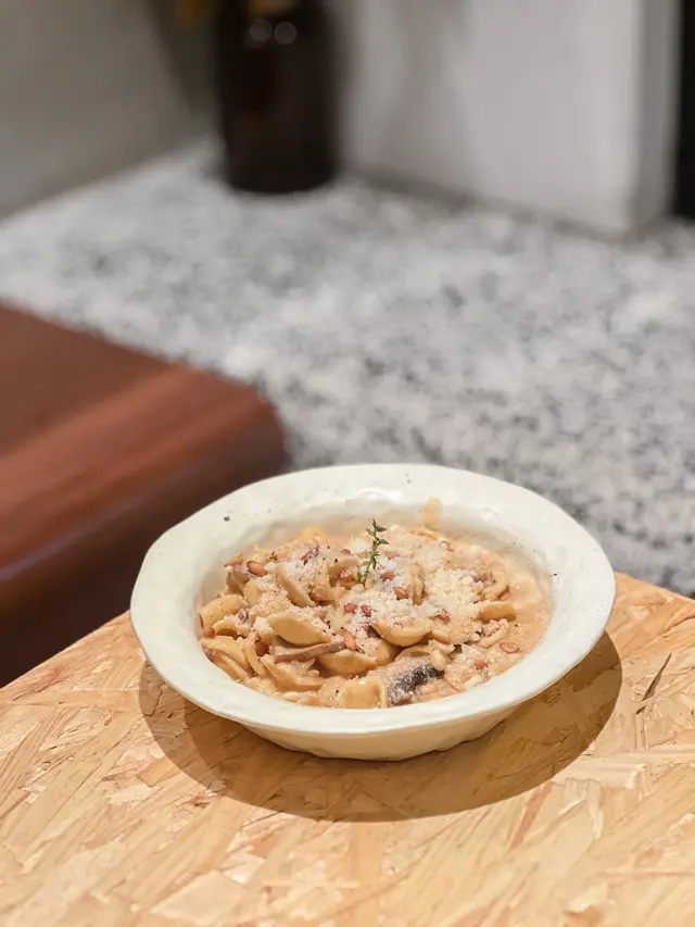 貓耳朵上鋪有滿滿的醬汁及芝士粉 食落有淡淡的松露味 大啡菇切片 份量都好足😳貓耳朵有咬口 加左松子仁 令口感更豐富