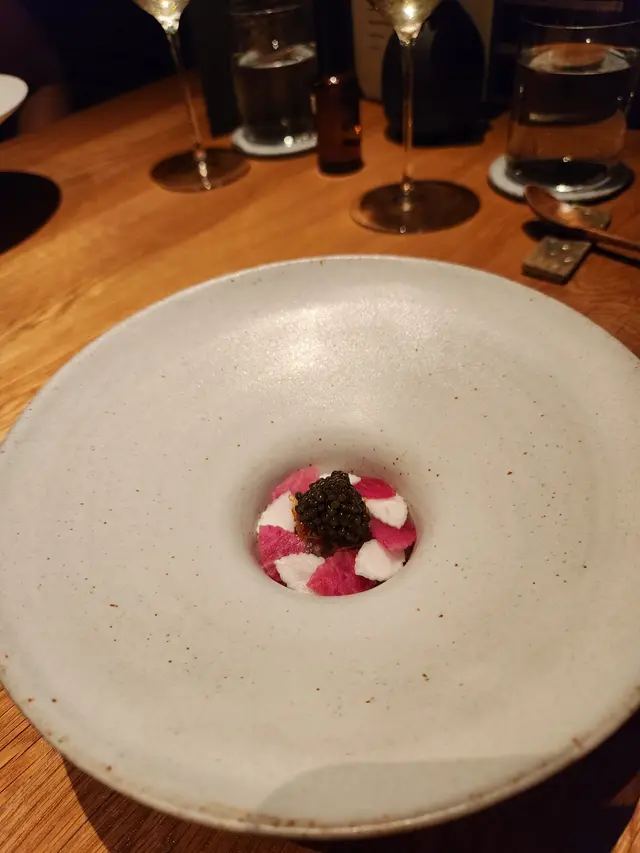 擺盤啱晒打卡😈真係好似一朵花咁靚🤭,當中嗰啲花瓣就係薑同埋蘿蔔製成嘅🤤我自己本身都好鍾意食,所以每一佢片花瓣我都係食晒㗎🤫藍旗吞拿魚上都係有魚子醬😍超級奢華✨。吞拿魚入口即溶👍🏻