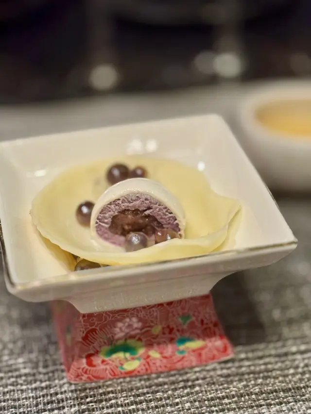 紫薯慕斯綿密香甜,白朱古力鏡面光滑如珍珠,紅豆爆珠咬開爆汁,酒香啫喱微醺。甜中帶苦,猶如迎春被命運折磨嘅短暫人生,精緻卻帶淡淡哀愁。