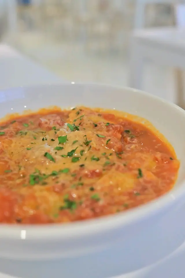雲吞界嘅爆漿流心包💥!一咬開Mozzarella拉絲拉到去枱邊🤤,混入檸檬皮碎嘅Ricotta芝士竟然有果香!自家製雲吞皮薄過蟬翼,墊底嘅蕃茄濃醬,食完成個嘴油淋淋要即時補妝💄