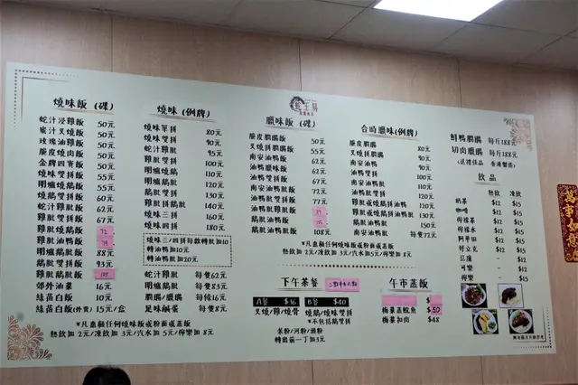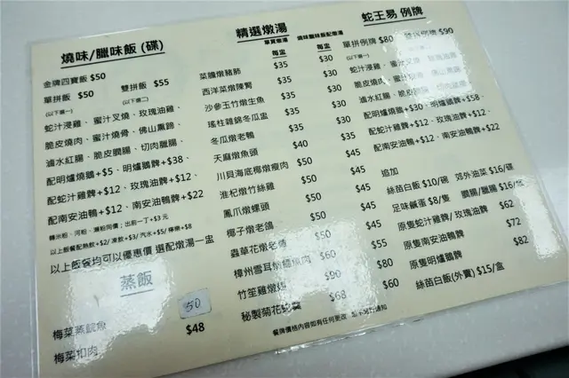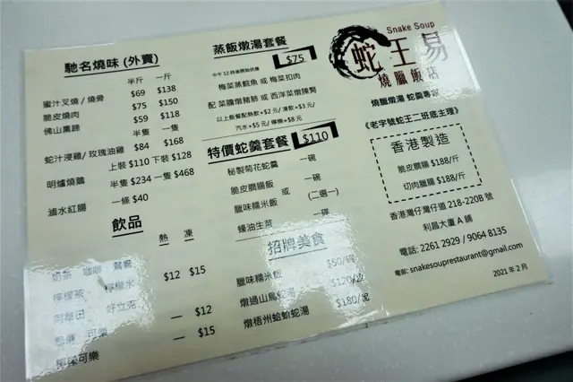 雖然枱上已放有餐牌,不過,好似跟牆上嘅巨型餐牌又有啲唔同,所以,都一齊貼晒出嚟俾大家參考。基本上,主打都喺燒味、臘味,仲有啲燉湯及套餐。因為得一支公,蛇羹定燉湯,臘味定燒味,只可以二擇其一。