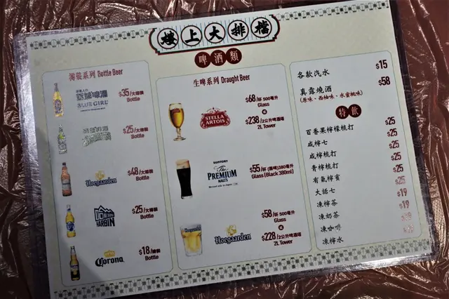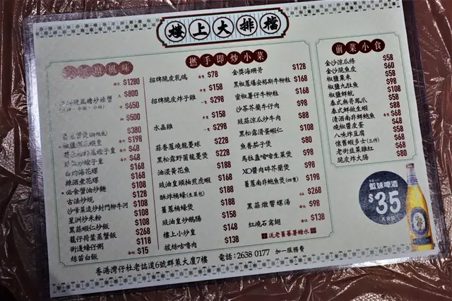 餐牌底面兩版,主打避風塘菜式以及各式小炒,而背頁就喺啤酒、汽水、特飲……等等。食到尾,同啲阿姐傾開,先知喺以前喜記炒蟹嘅總廚主理,早知就點啲避風塘菜式啦!