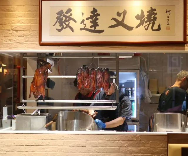 經過傳統明爐燒烤的燒鵝,外皮香脆,色澤均勻,鵝肉質感細緻鮮嫩,肉汁豐腴,做出皮脆肉嫩、充滿鵝油香氣的效果。