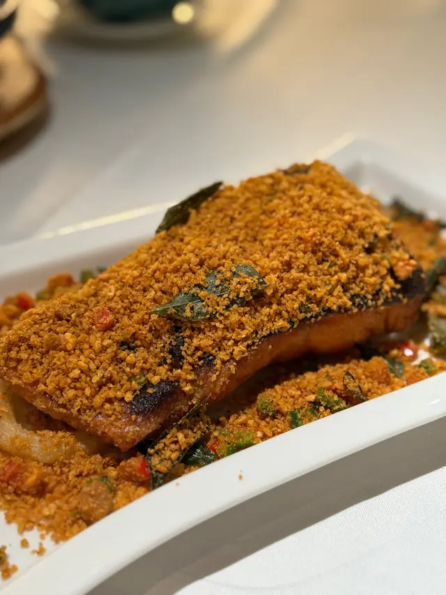 龍羊峽虹鱒魚係青海著名水產,肉質較為結實,脂肪含量較高🐟 三文魚扒嘅外皮煎得好香脆,以避風塘嘅方式烹調,魚扒上面鋪滿炸蒜,超級惹味👍🏻