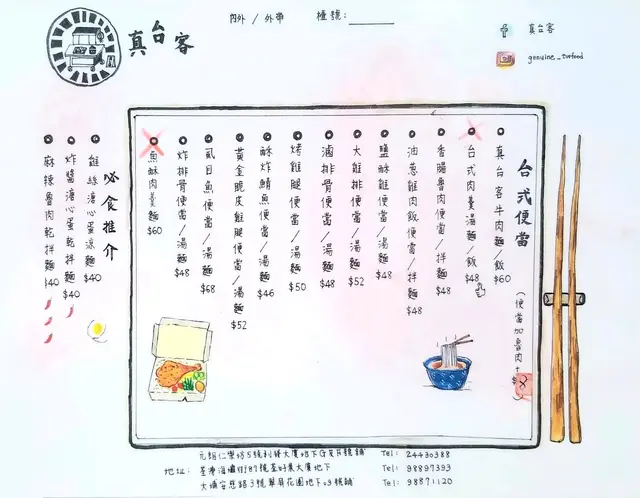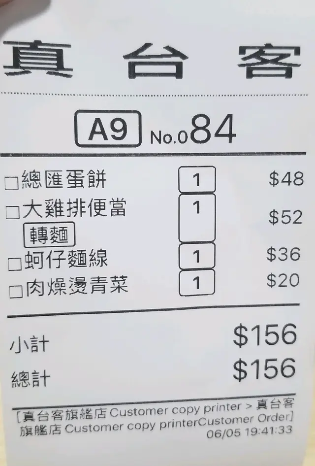 【元朗】一般般台灣美食 joelui622Level 32021-06-06565 views Follow 今天入元朗找老佛爺食晚餐,由她介紹食台灣野,門口有幅大壁畫都幾靚,內裏都坐得舒適,不太迫。餐點款式不多,價錢也算合理,自行用蠟筆圈好交侍應便可,方便快節。內設有冬瓜茶,任由顧客自斟自飲。1我不太餓,只點了總會蛋餅,大雞排麵,蚵仔米,肉燥油菜。首碟上枱,肉燥油菜,肉燥太少,得幾粒肉,不夠配食。蚵仔米線,不過不失。大雞排麵,雞排好出色,好香口,雞肉嫩滑,但個麵就真係好失色,麵好硬,煮得不夠耐,湯不燙而且非常淡。蛋餅大路,不過不失。埋單156元,人均78元,還可以吧!食品有好大進步空間。The above review is the personal opinion of a user which does not represent OpenRice's point of view.LikeShare【元朗】一般般台灣美食 真台客 https://s.openrice.com/QrKT0nh4yW0Report Post Ratings3Taste4Decor4Service4Hygiene3ValueDate of Visit2021-06-05Dining MethodDine InSpending Per Head$78