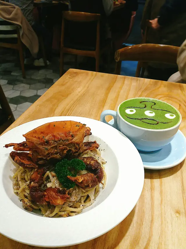 這裡的咖啡和牛奶熱飲都有精美拉花,但圖案是隨機的。我點了綠茶鮮奶,便深深期待著! 三眼仔拉花維妙維肖,慢慢攪拌下,綠茶香氣撲鼻,入口奶泡香滑,非常Creamy,喝到半滿時,杯底的綠茶粉更是衝擊味蕾。