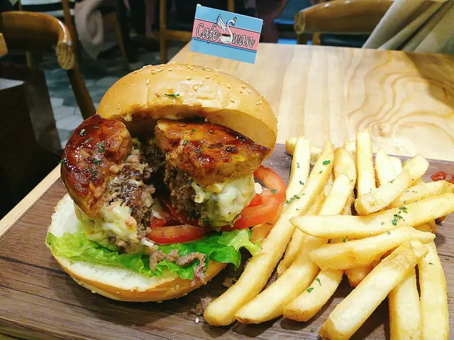 鵝肝和牛巨人漢堡真是King Size,半蓋上的漢堡顯露出肥美的鵝肝、厚實的牛肉及蕃茄生菜等,已經叫我滿心歡喜。先吃脆卜卜的薯條,打開滋味的開端。切開巨人漢堡,看到鵝肝油光濕潤,入口軟綿、細膩,只想在口中慢慢細嚼品味。