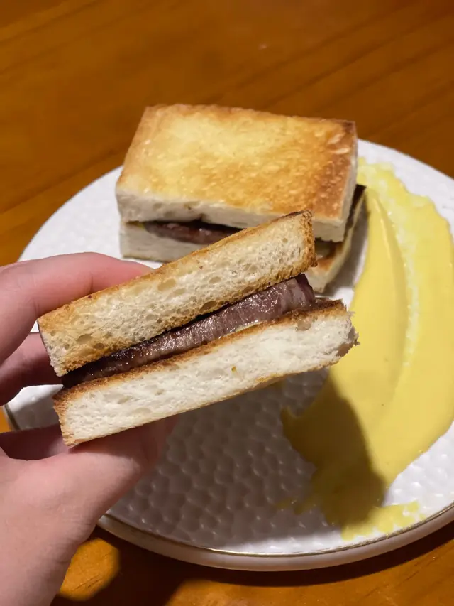 再嚟A5宮崎櫻花牛牛柳三文治!酥脆多士夾着燒到油香爆發嘅牛柳,咬落好多肉汁!