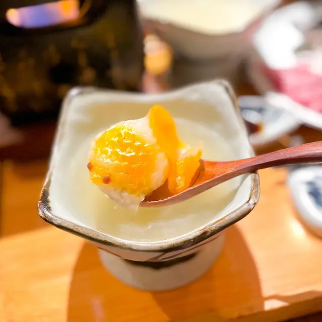 金魚湯定食包括咗白飯配飯素、楓糖流心蛋、櫻花金魚湯。煙韌飯粒加咗飯素後,脆口紫菜碎同醬汁令口感更豐富。流心蛋口感一樣;櫻花金魚湯湯底同大根湯係一樣,面金魚仔就係蝦肉丸,蝦味濃又夠彈牙👍🏻