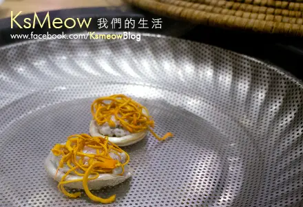 「八頭南非鮮鮑魚」$68/隻,蒸後的鮑魚既爽彈又具鹹鮮,與面層爽脆的蟲草花非常搭配,不蘸醬油,也感美好。