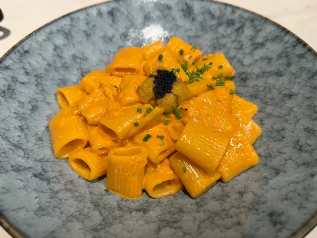 「海膽醬魚子醬蟹肉短管麵」以海膽醬為靈魂🧡 短管麵掛汁,搭配鮮美的蟹肉,海膽醬呈橙黃色,視覺效果一流,醬汁味道鮮甜,魚子醬提升咸香與鮮美,每一口都能感受到海洋的滋味🌊