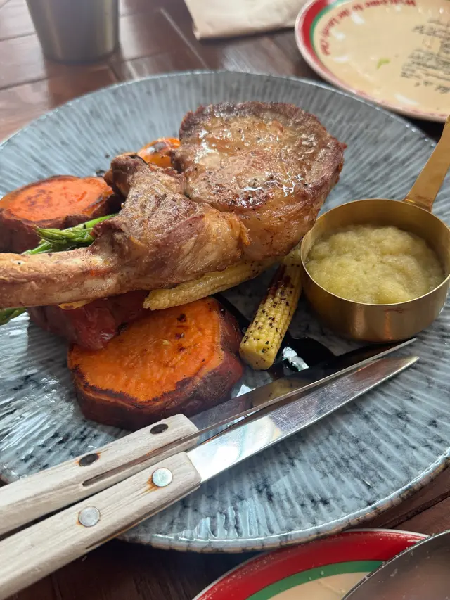 主菜豬鞍顛覆預期:厚切豬鞍架經低溫慢煮鎖住肉汁,表皮烙上細密格紋,切開時泛著淡粉色的肌理令人動容。最妙是那抹青蘋果蓉,如初春微風拂過舌尖,巧妙解構油脂的滯重。