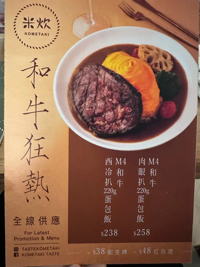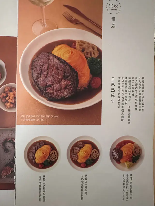 【日式咖喱。旋風蛋包飯】 Nutty LifeLevel 42024-06-13765 views Follow 米炊位於K11 Art Mall 1樓的一個角落,地方寬敞舒適。餐牌裡有多達22款咖喱旋風蛋包飯!蛋以旋風形態完整包著米飯,很有特式。❈ M4和牛肉眼扒蛋包飯 HK$258生啤 (加配價錢 HK$38)220g肉眼扒肉質軟滑配搭米炊自家秘製咖喱汁,肉眼扒沒有被咖喱汁味道蓋過。咖喱汁不濃不辣,粒粒七星夢美人白米飯沾上咖喱汁,非常惹味。生啤,小小一杯,冰凍清爽。1❈ 奶油蘑菇汁慢煮厚燒牛脷+薯餅配特飲 HK$198牛脷口感軟腍。奶油蘑菇汁,奶油味重蘑菇略少。薯餅外脆內軟,香甜紫 薯味重👍🏼☆分類標籤#nuttylife 337The above review is the personal opinion of a user which does not represent OpenRice's point of view.LikeShare【日式咖喱。旋風蛋包飯】 米炊 (K11購物藝術館) https://s.openrice.com/QrKT0xYLK00Report Post Ratings3Taste4Decor3Service4Hygiene3ValueDining MethodDine In