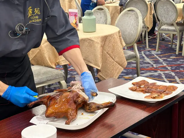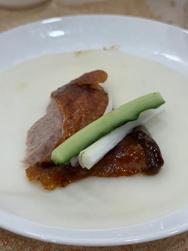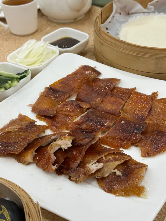 即叫即片!仲要係客人面前片!保證新鮮🥰!外皮香脆,肉質鮮嫩,搭配薄皮、青瓜條、京蔥絲、甜麵醬和白糖等配料,咸咸甜甜,充滿層次感🫶🏻。