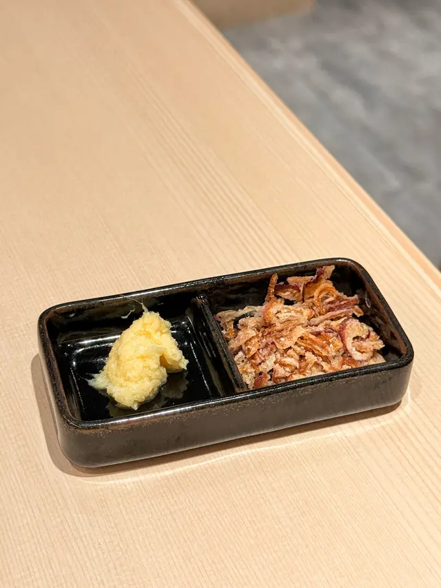 第一次試抹茶味拉麵,湯底係雞白湯加入抹茶,變成淡綠色。淡淡的抹茶加入咗喺湯底度,抹茶味溫和,無搶走雞湯嘅鮮味,但湯底比較多雞油。粗身麵條掛湯效果不錯,另外跟咗薑蓉同炸蒜,可以自己加。配料有三塊雞胸肉同多款蔬菜,包括南瓜、粟米芯等