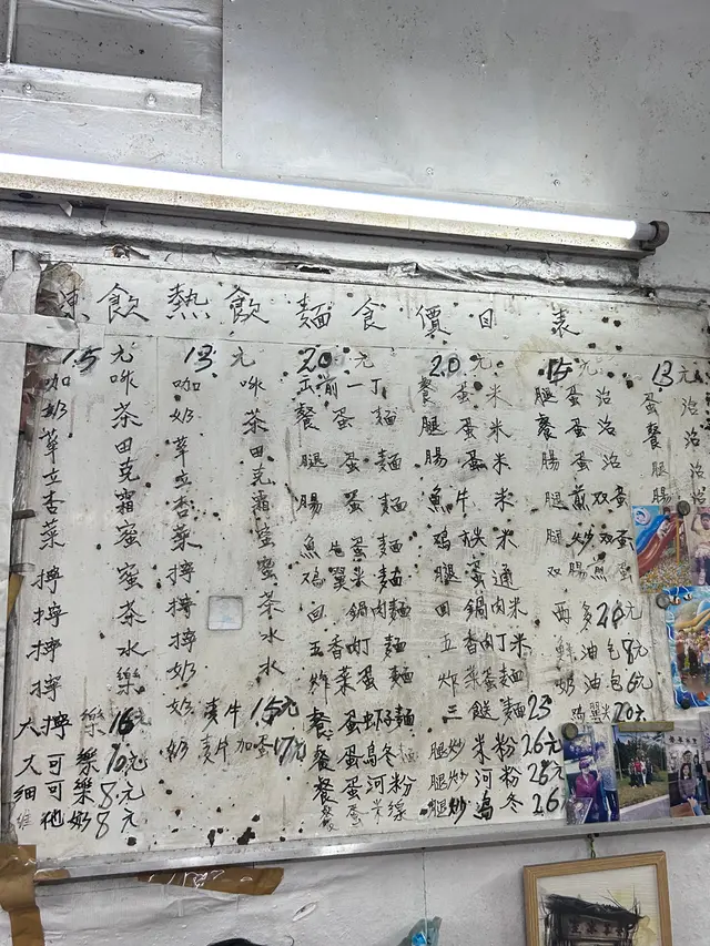 牆上嘅手寫餐牌、天花板上嘅舊式白色吊扇 ...