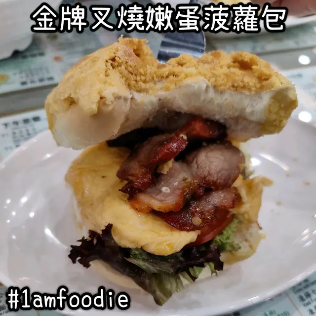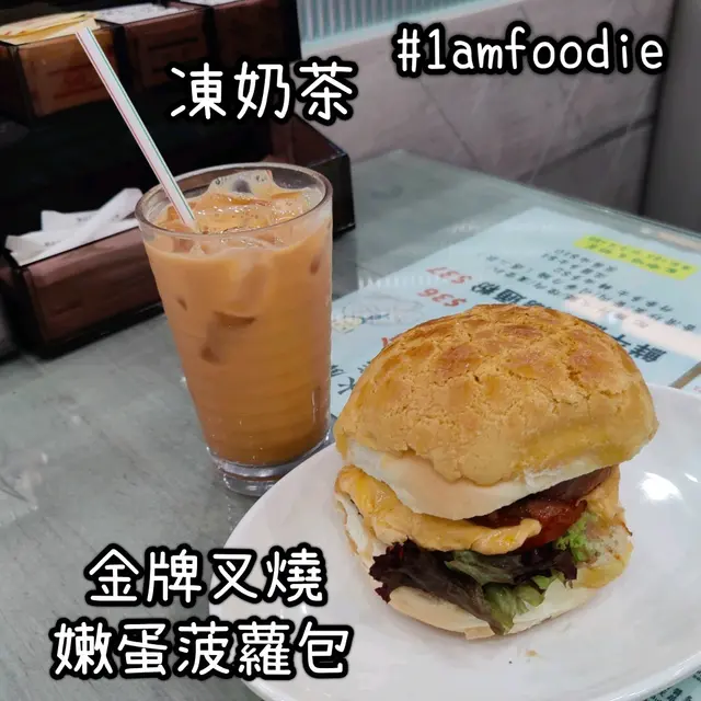 我當時唔算話好肚餓,見佢有「古法秘製菠蘿包餐」就食個 $42 嘅「金牌叉燒嫩蛋菠蘿包」,加 $3 飲「凍奶茶」。就係幾片叉燒加個炒蛋再加啲沙律菜夾喺個菠蘿包入面,只能夠講係 good try 但味道係僅屬一般嘅。