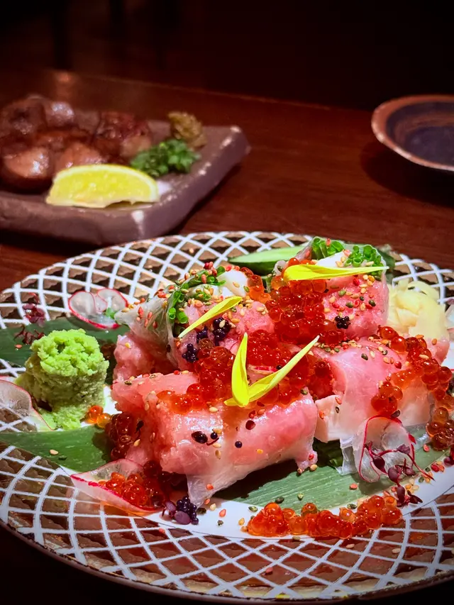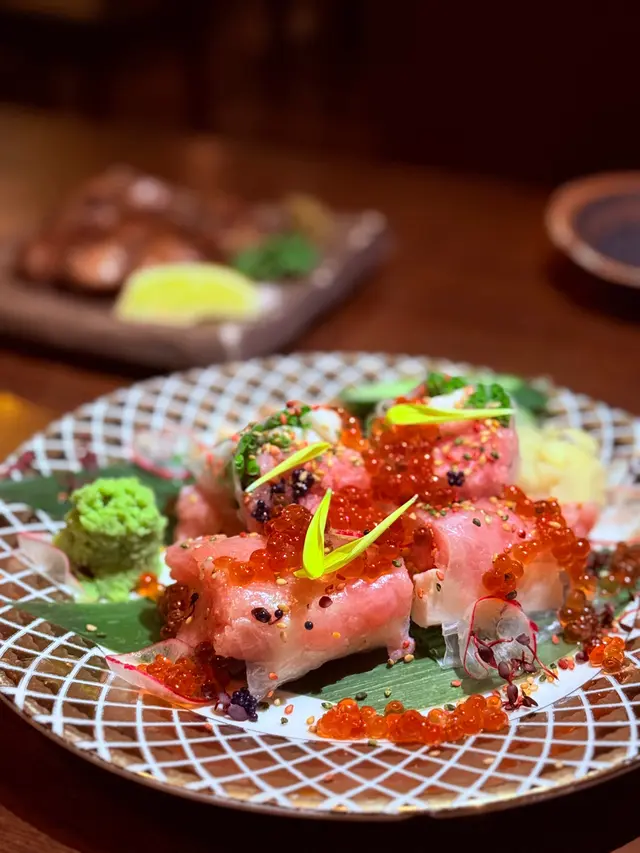 米紙卷幾有驚喜!口感清新,裡面嘅餡料絕對可以以海量形容,巨多拖羅蓉,啖啖都非常軟綿綿,加上三文魚籽,鹹香十足,唔會太膩。