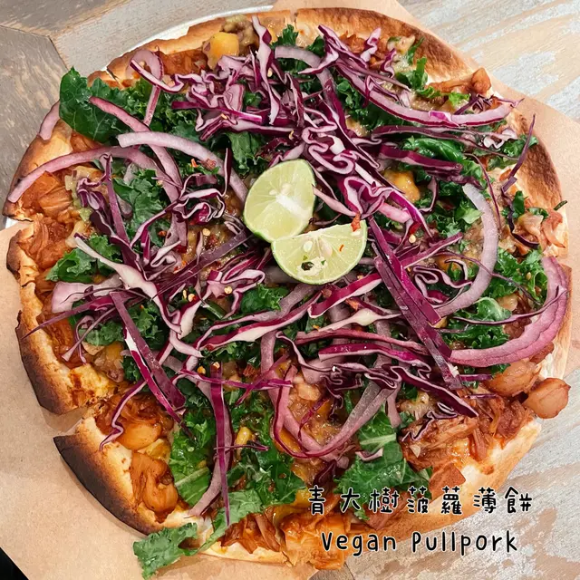 青大樹菠蘿薄餅 Vegan Pullpork Pizza用左大樹菠蘿黎扮豬肉絲,個口感都有少少似。雖然冇芝士,但個pizza一啲都唔失色,啲醬好夠味,而且亦令個pizza冇咁乾。