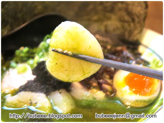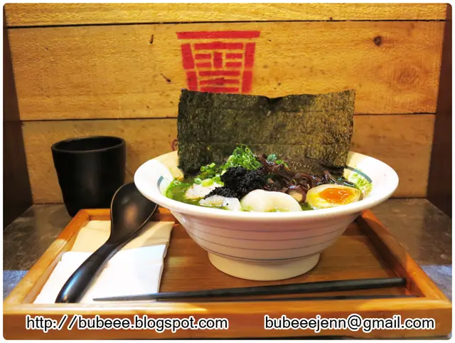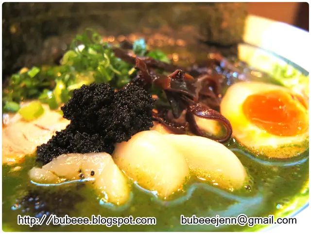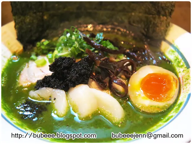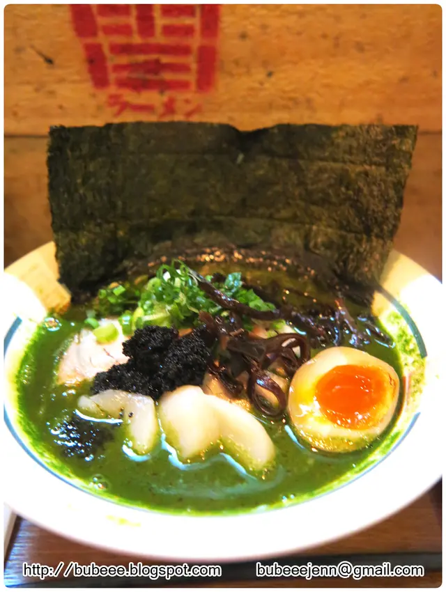 青麟的食材包括菠菜汁豚骨湯、溏心玉子、叉燒、黑魚籽、珍寶刺身帶子、木耳及紫菜。